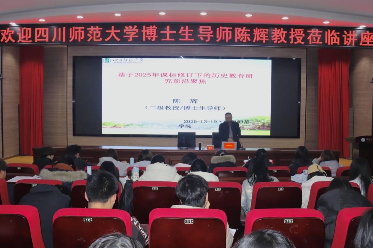 12月19日,四川师范大学博士生导师陈辉教授应邀莅临我校,为师生作了题为“基于2025年课标修订下的历史教育研究前沿聚焦”的学术报告。报告会由历史文化与旅游学院副院长曾亚英主持。